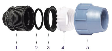 Система герметизації компресійного фітинга Unidelta складається з: затискної кришки, гумового ущільнювача, обтискного кільця (цанги) і втулки для запресовування. Завдяки простоті конструкції компресійні фітинги монтуються досить швидко, і їх можна збирати і розбирати багаторазово, без втрати робочих властивостей.