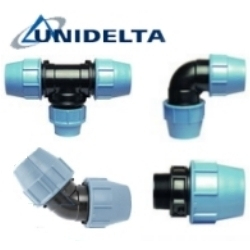 Компресійні фітинги Unidelta це спеціальні вироби для з'єднання труб з поліетилену з зовнішнім діаметром від 16мм і до 110мм (125мм для затискних хомутів). Вони сумісні з усіма трубами з поліетилену низької щільності, ПНД, поліетилену 40, поліетилену 80, поліетилену 100 і реалізовані згідно з нормативними вимогами EN 12201, ISO 4427, ISO 14236, ISO 13460, DIN 8074. Зазвичай фітинги Унідельта використовуються для транспортування питної води і рідини під тиском до 16 бар для різних цілей. Завдяки матеріалам, з яких вони виготовлені, перехідники мають високу опірність до різних хімічних речовин і стійкі до променів УФ.